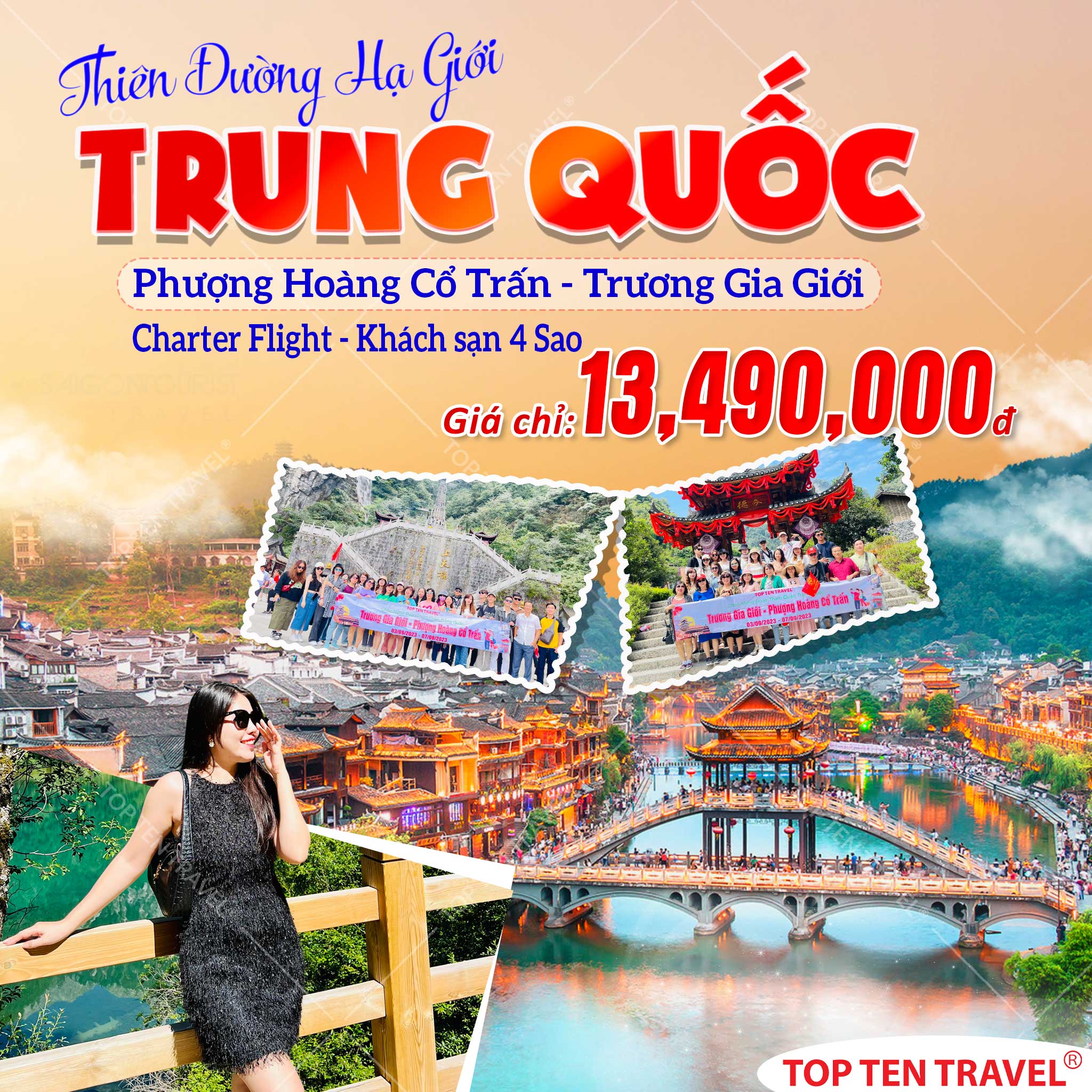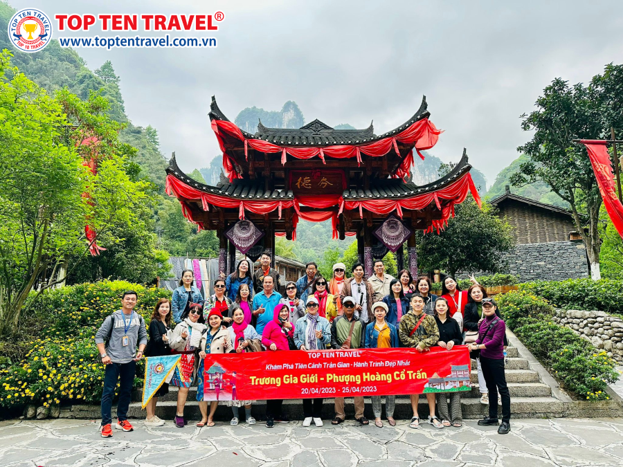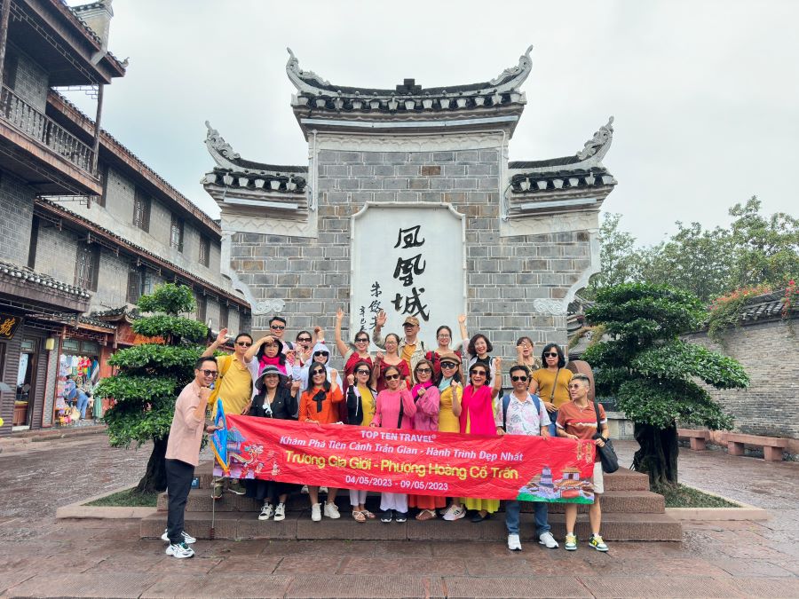 Đoàn nghỉ đêm tại Trương Gia Giới. o thông quan trọng nối liền đôi bờ sông của Phượng Hoàng Cổ Trấn.
