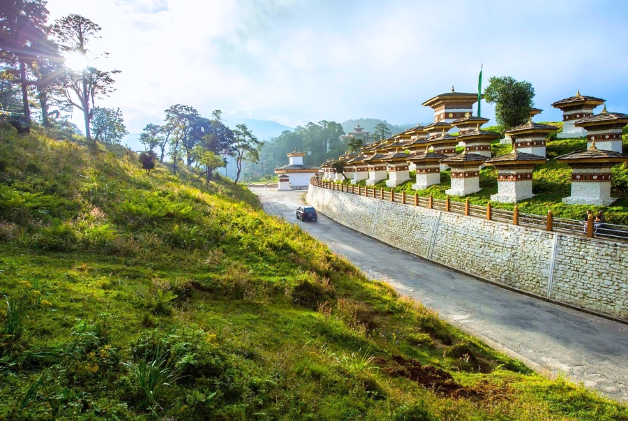 Đoàn di chuyển qua Đèo Dochula với độ cao 3.100m, nổi bật với quần thể 108 bảo tháp Druk Wangyal uy nghi. Từ trên đèo, du khách có thể chiêm ngưỡng dãy Himalaya hùng vĩ trong biển mây, một trong những khung cảnh đẹp nhất Bhutan.