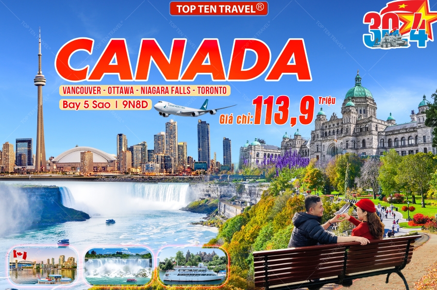 Bạn đã sẵn sàng cho chuyến du lịch đến xứ sở lá phong – nơi hội tụ vẻ đẹp thiên nhiên hùng vĩ, những thành phố hiện đại và nền văn hóa đa sắc màu chưa? Top Ten Travel hân hạnh giới thiệu tour Canada 9 ngày 8 đêm, đưa bạn khám phá những địa danh nổi tiếng như Toronto sôi động, thác Niagara hùng vĩ, Montreal lãng mạn và Vancouver xinh đẹp. Hành trình được thiết kế trọn gói, dịch vụ cao cấp, giúp bạn tận hưởng kỳ nghỉ tuyệt vời với những trải nghiệm khó quên. Sau đây là một vài điểm nhấn đặc biệt dành tặng riêng cho du khách trong hành trình tour này: