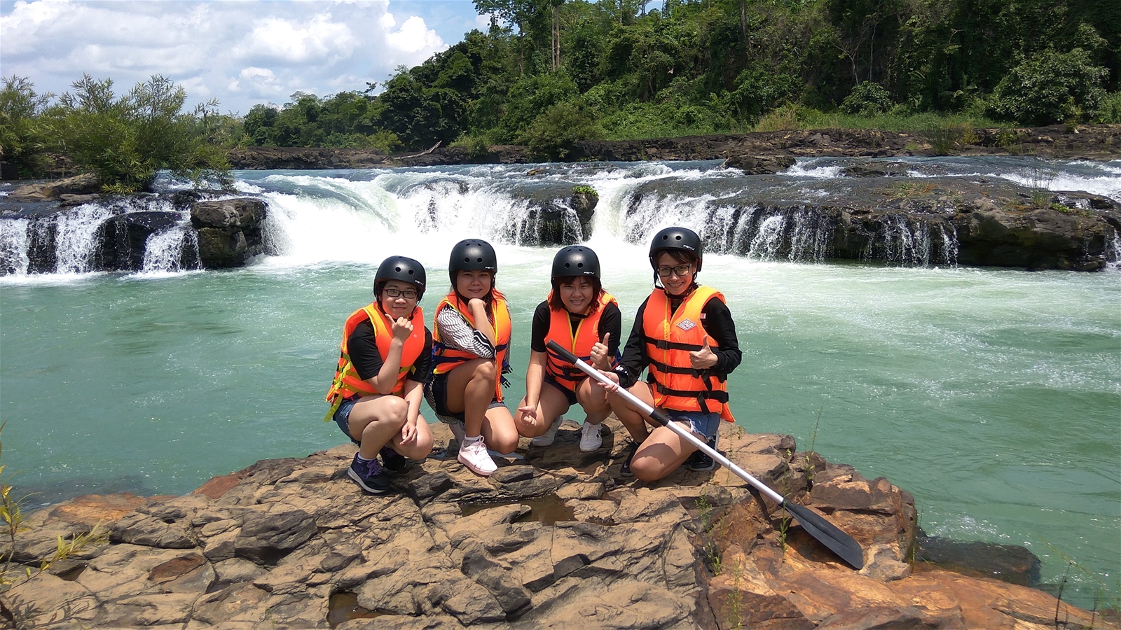 ➖ 09h15: Quý khách tập trung xuống dưới thác nhận áo phao, gậy đi bộ và bắt đầu chuyến Trekking dài 500m, men theo những triền đá cổ xưa hình thù độc đáo, thưởng ngoạn cảnh đẹp hùng vĩ với một bên là vách núi, một bên là dòng sông Sêrêpôk xanh ngắt.